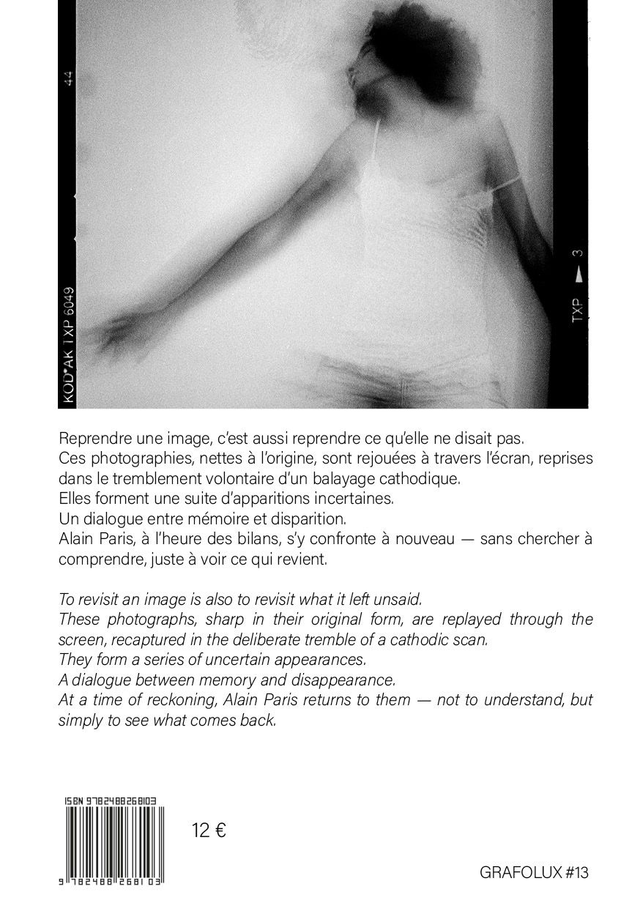 To revisit an image is also to revisit what it left unsaid. These photographs, once sharp, are replayed through the screen, recaptured in the tremble of a cathodic scan. They become a series of uncertain appearances, a dialogue between memory and disappearance. At a time of reckoning, Alain Paris returns to them — not to understand, but simply to see what comes back.