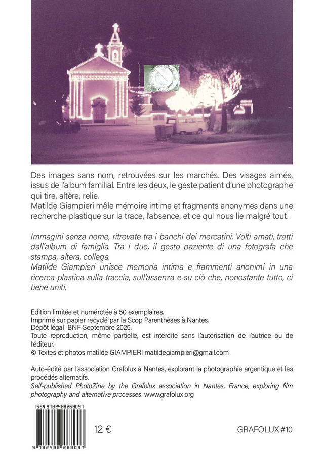 Des images sans nom, retrouvées sur les marchés. Des visages aimés, issus de l’album familial. Entre les deux, le geste patient d’une photographe qui tire, altère, relie. Matilde Giampieri mêle mémoire intime et fragments anonymes dans une recherche plastique sur la trace, l’absence, et ce qui nous lie malgré tout.